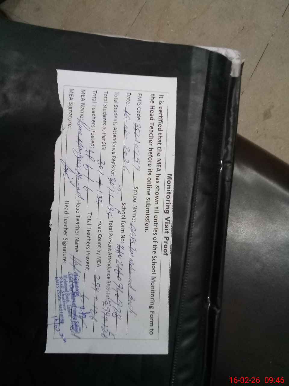 | Attendance Register | Head Teacher | MEA with School | Visit Proof |