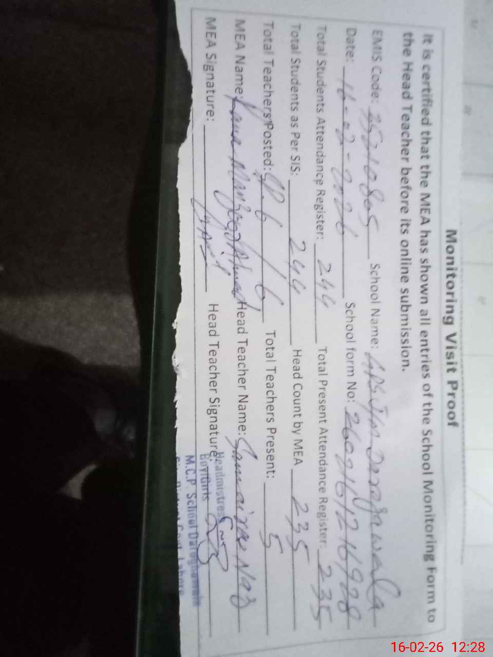 | Certified that this School was Inspected by the Undersigned MEA/DMO Today and the Information Stated Above is as Per Record. | |||||