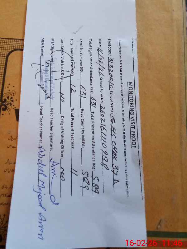 | EMIS Code: 31320010 | Name of School: GHS CHAK NO.37/A | |||