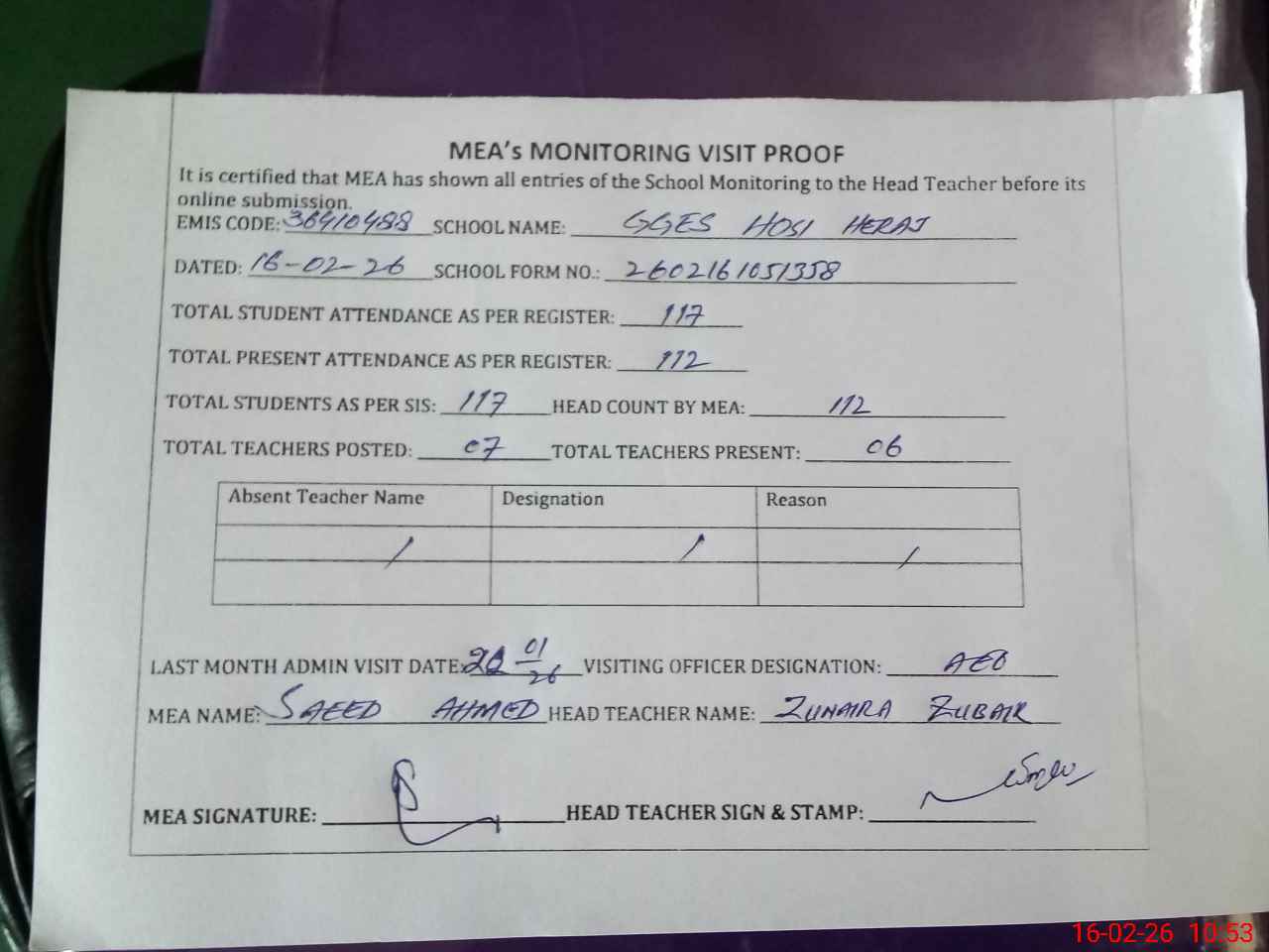 | Attendance Register | Head Teacher | MEA with School | Visit Proof |