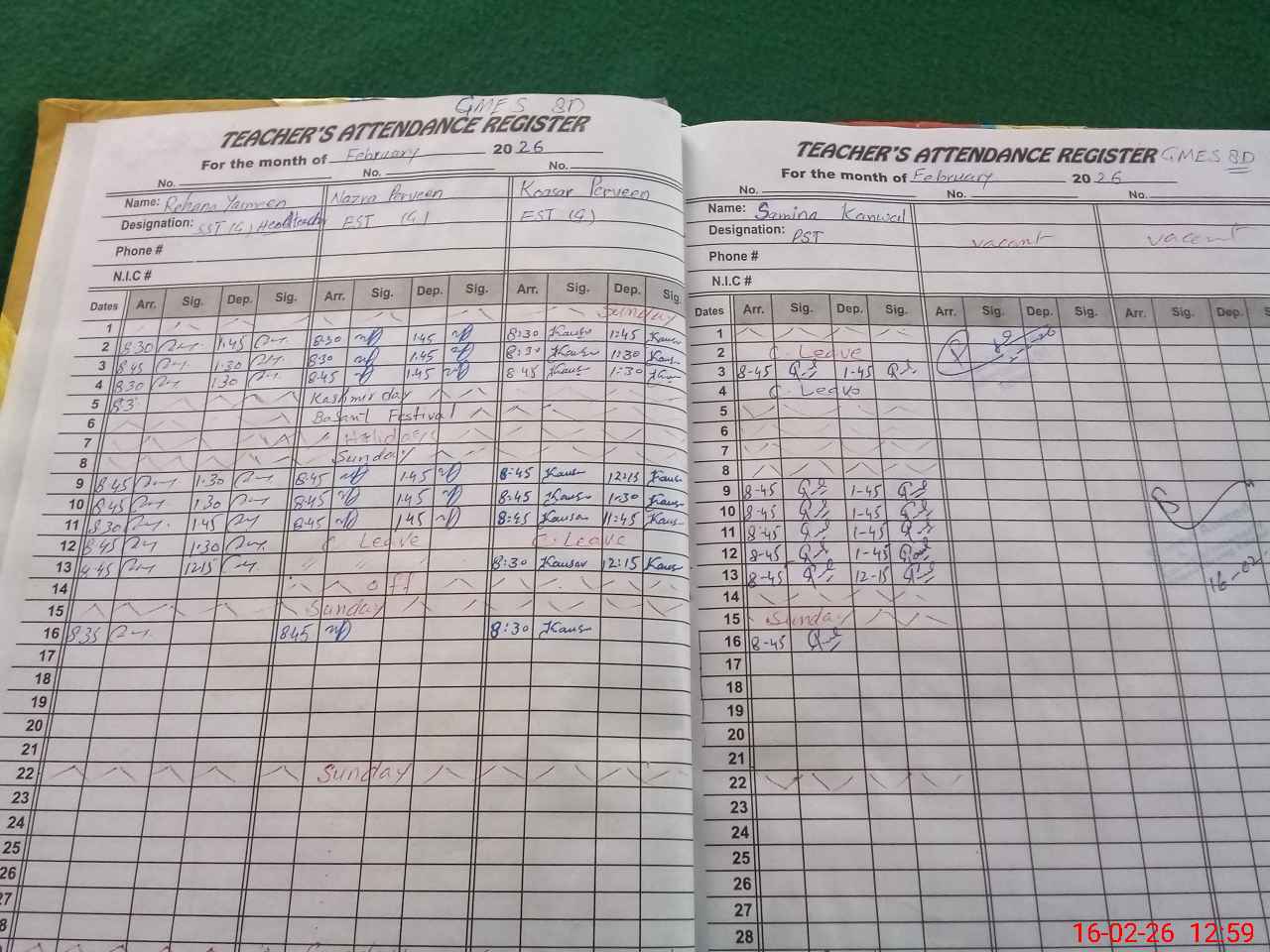 | CNIC | Full Name | Designation | R/C | Absence During Last Calender Month |