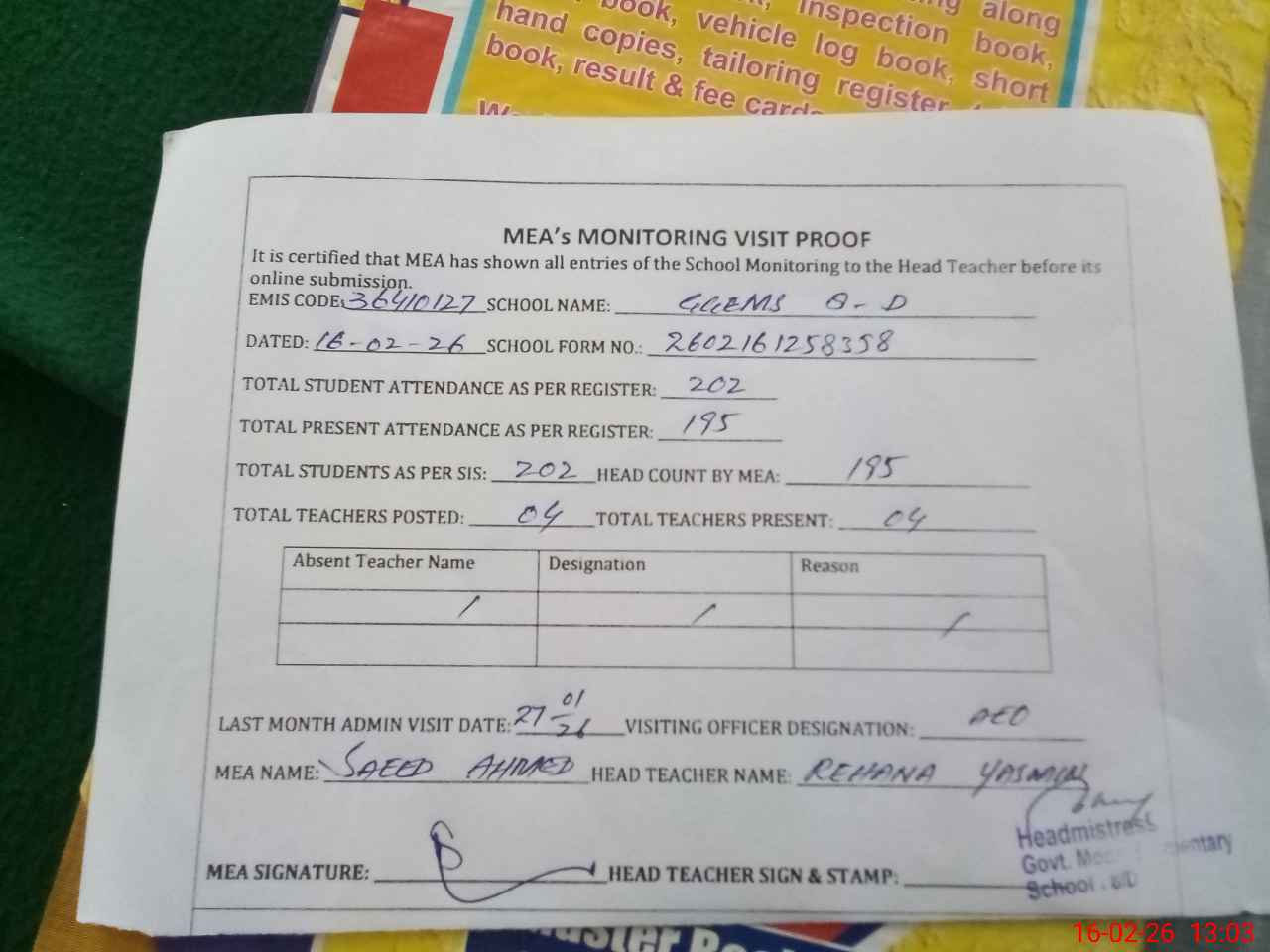 | Attendance Register | Head Teacher | MEA with School | Visit Proof |