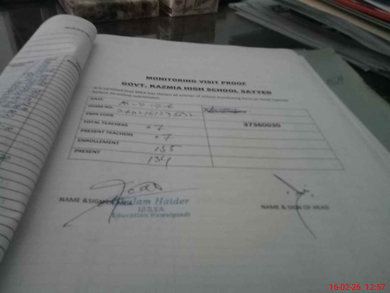 | Attendance Register | Head Teacher | MEA with School | Visit Proof |