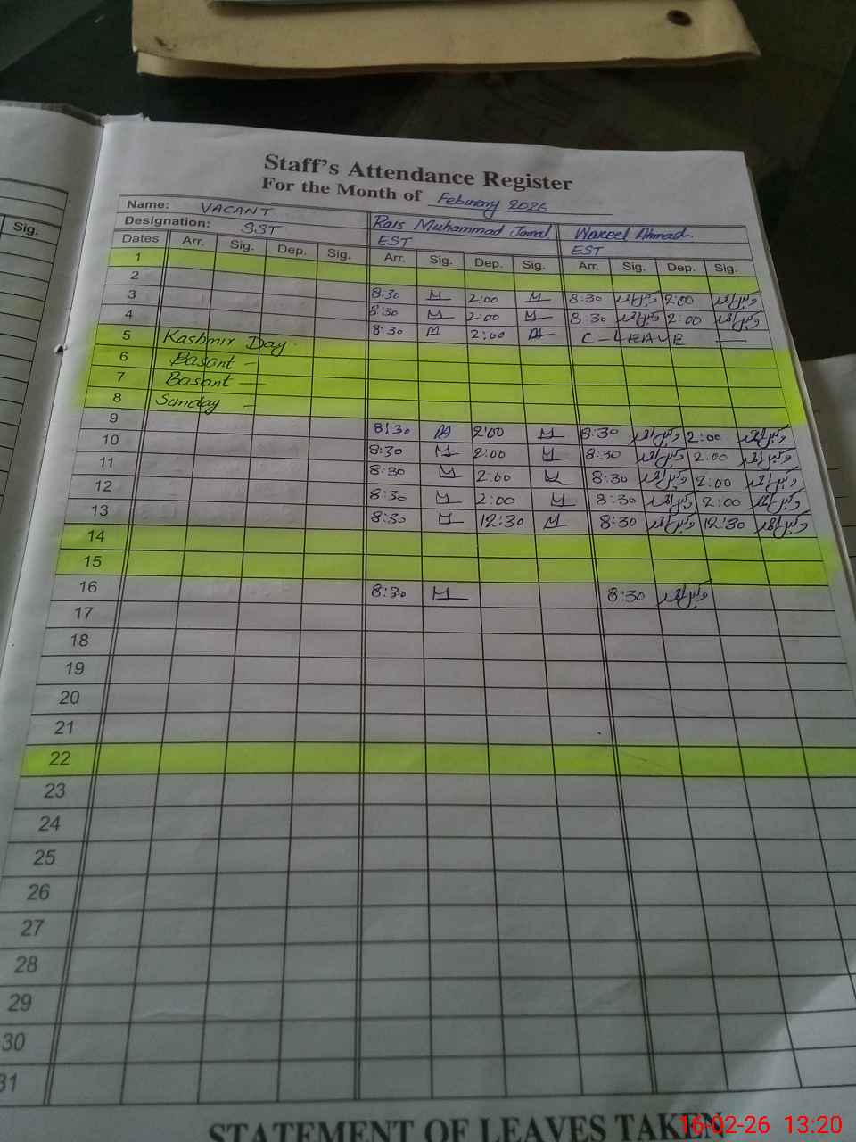 | CNIC | Full Name | Designation | R/C | Absence During Last Calender Month |