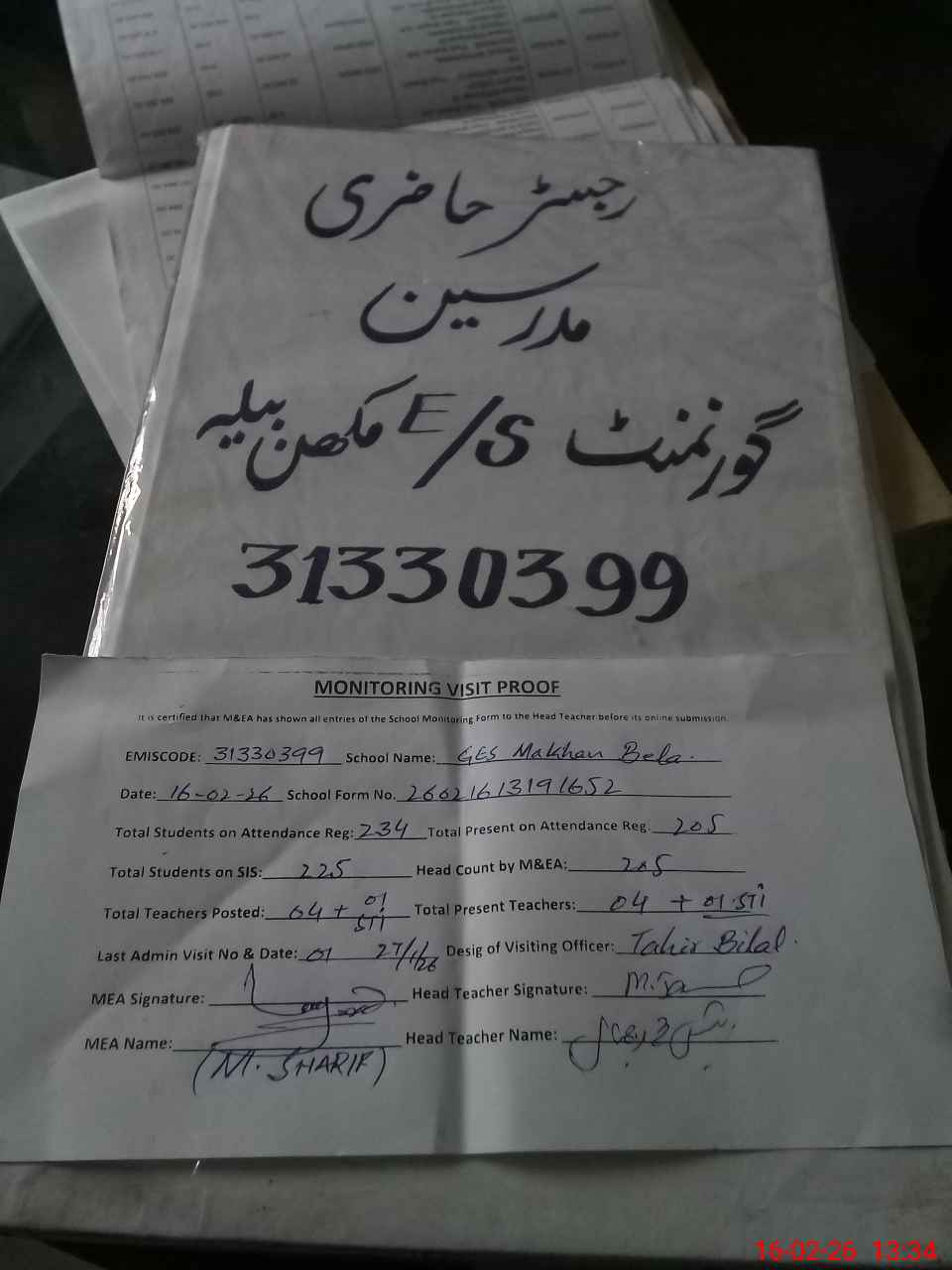 | Attendance Register | Head Teacher | MEA with School | Visit Proof |