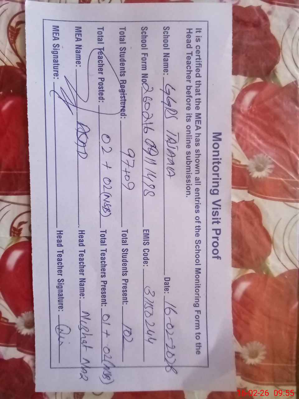 | Remarks (Use Separate Page if Required): Head teacher found absent School building is fully dangerous 3 Bathroom are non Functional as there is no water available over head water tank is non functional No. NSB record shown to MEA No books issue record Available in the school | |||||