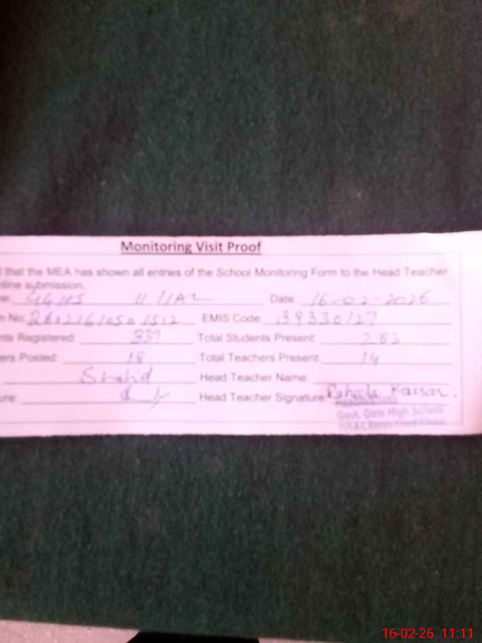 | Attendance Register | Head Teacher | MEA with School | Visit Proof |