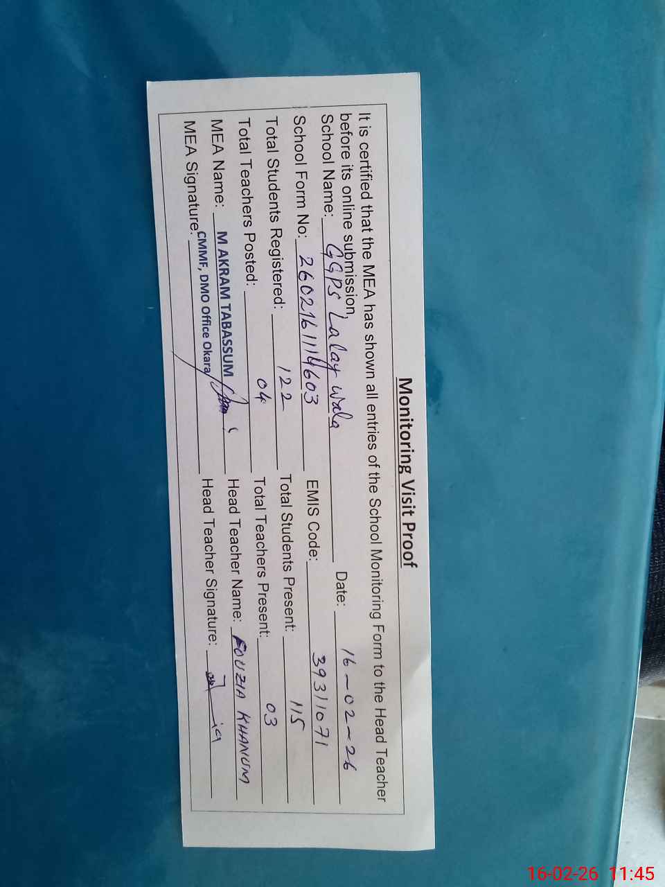 | Attendance Register | Head Teacher | MEA with School | Visit Proof |