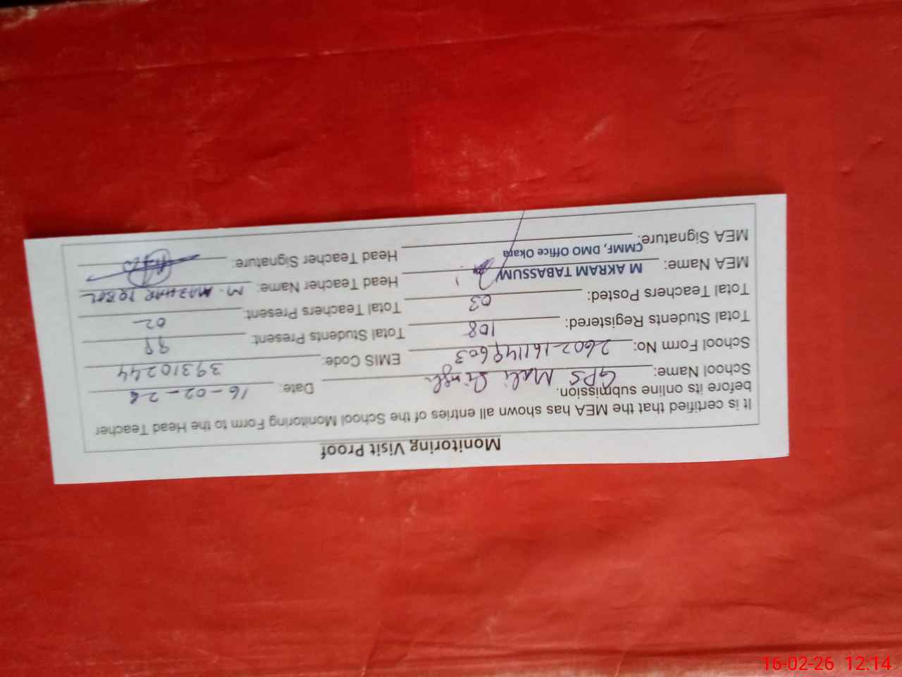 | Certified that this School was Inspected by the Undersigned MEA/DMO Today and the Information Stated Above is as Per Record. | |||||