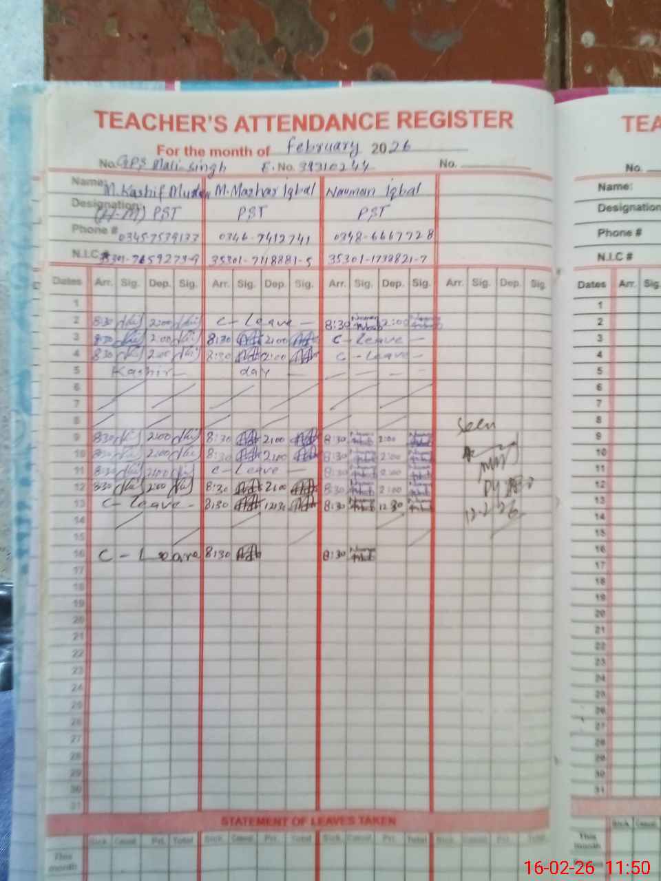 | CNIC | Full Name | Designation | R/C | Absence During Last Calender Month |