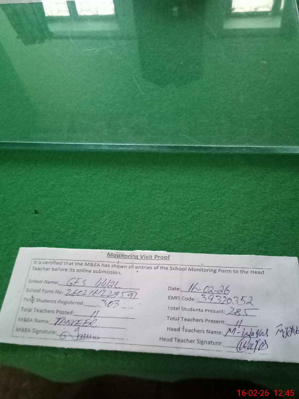 | Attendance Register | Head Teacher | MEA with School | Visit Proof |