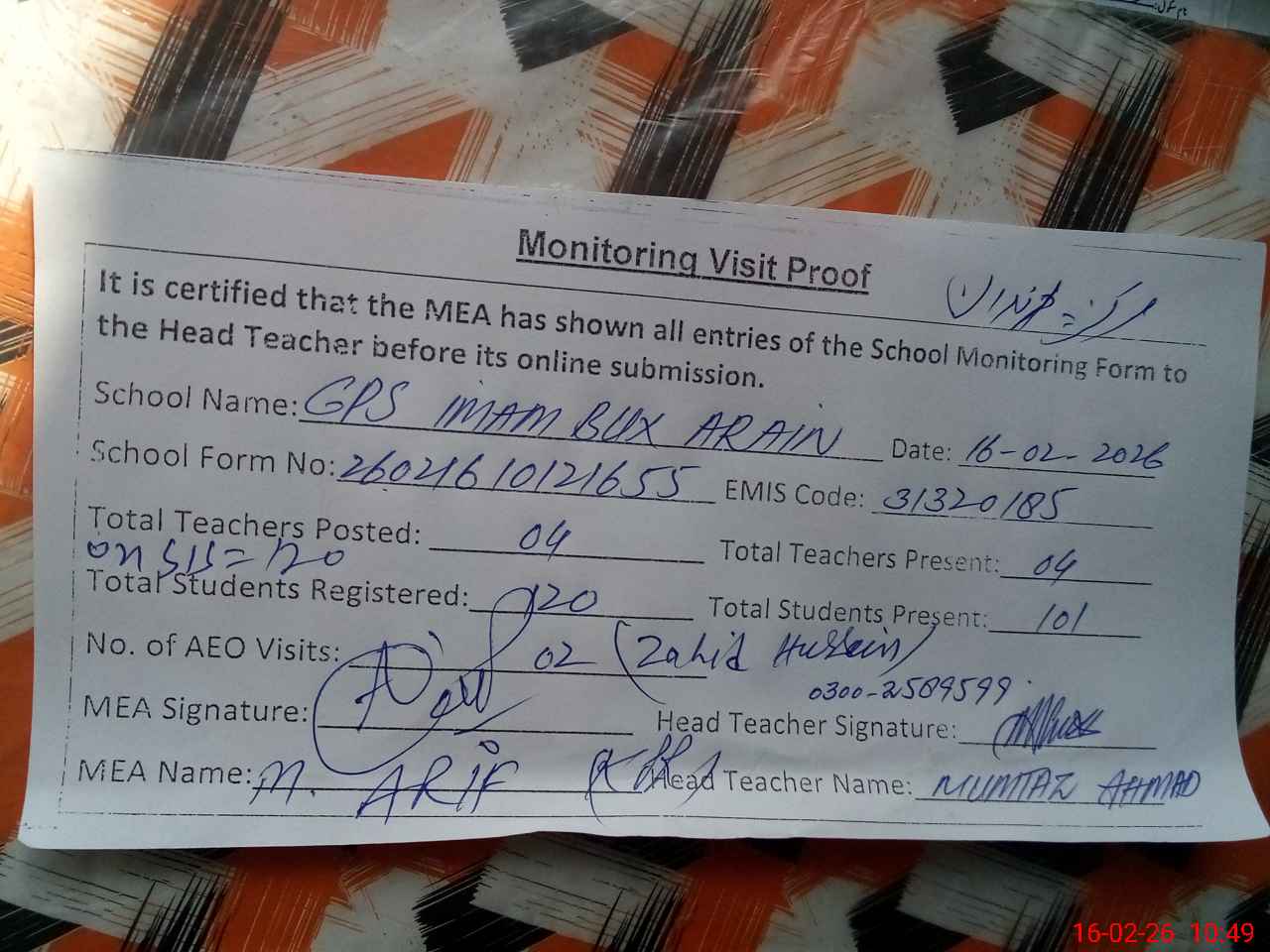 | EMIS Code: 31320185 | Name of School: GPS IMAM BAKHASH ARAIN | |||