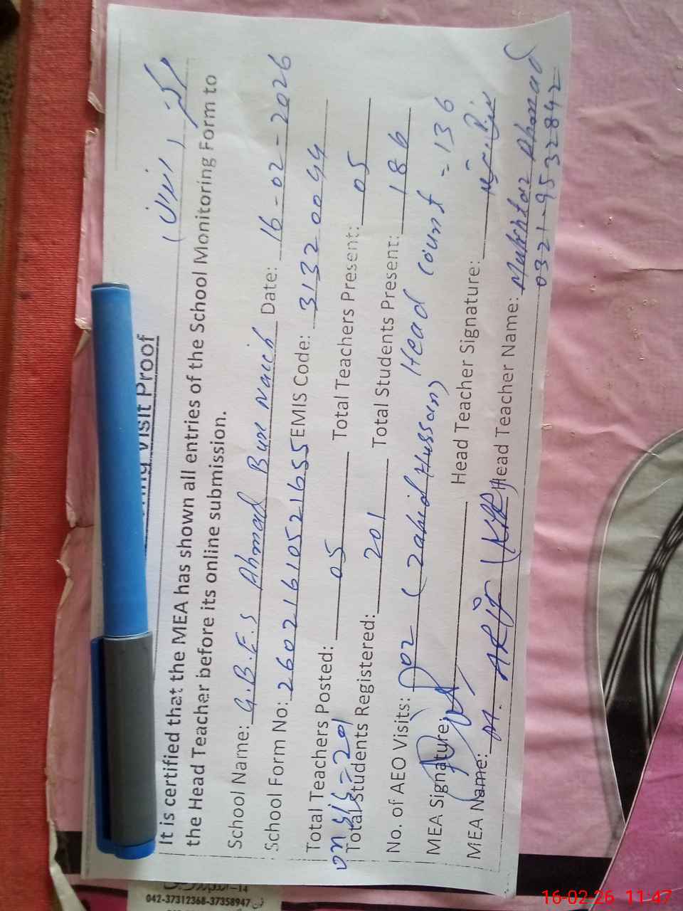 | Attendance Register | Head Teacher | MEA with School | Visit Proof |