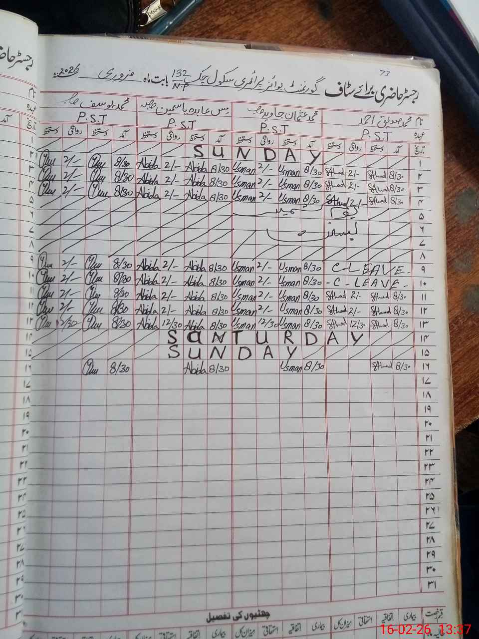 | CNIC | Full Name | Designation | R/C | Absence During Last Calender Month |
