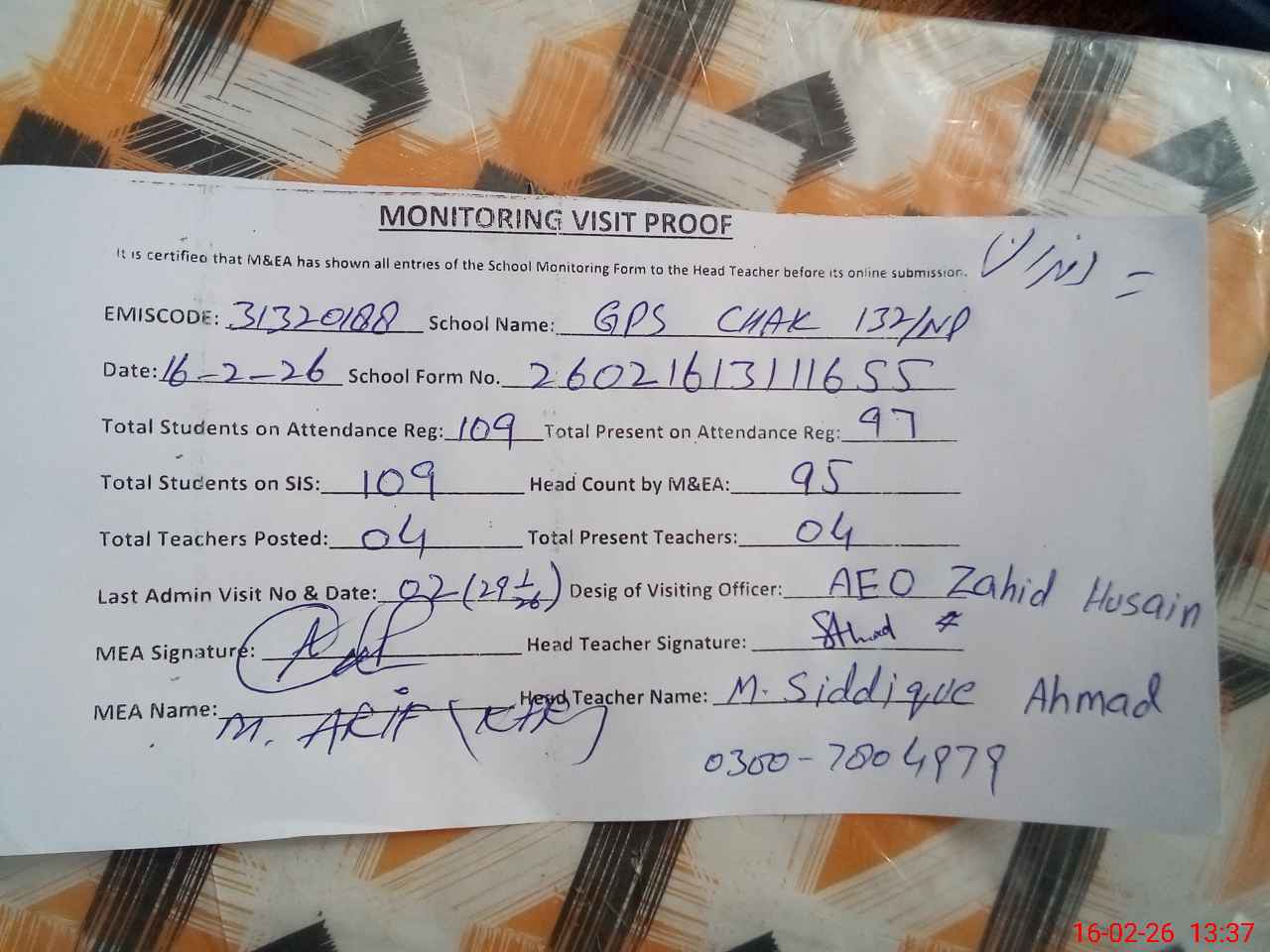 | EMIS Code: 31320188 | Name of School: GPS CHAK 132/NP | |||