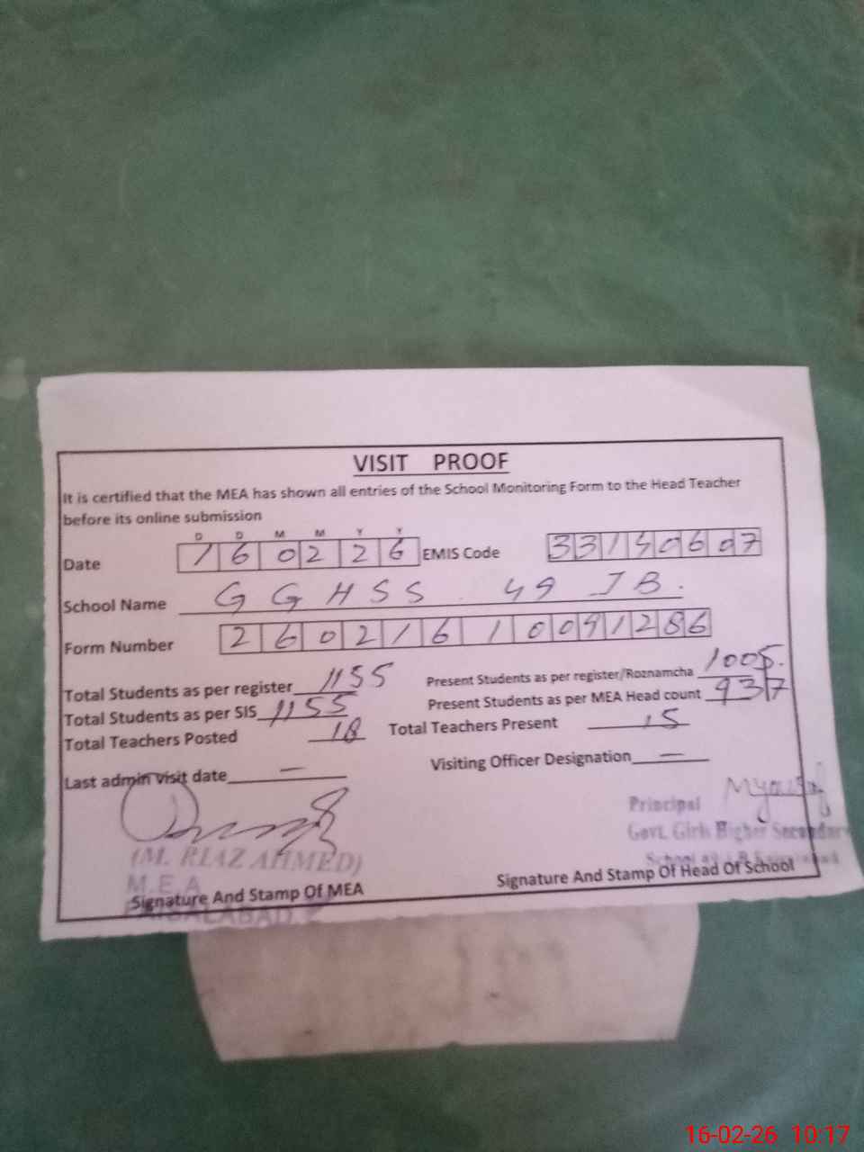 | Remarks (Use Separate Page if Required): Sir, Principal SB. Gulnaz Sumera and SST (Sci) Shahnila Bashir both Absent while no leave record found in school also mark C/Leave in Attendance Register. | |||||