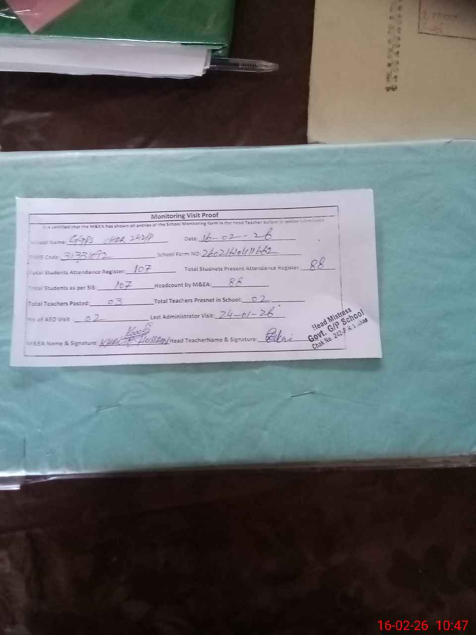 | Attendance Register | Head Teacher | MEA with School | Visit Proof |