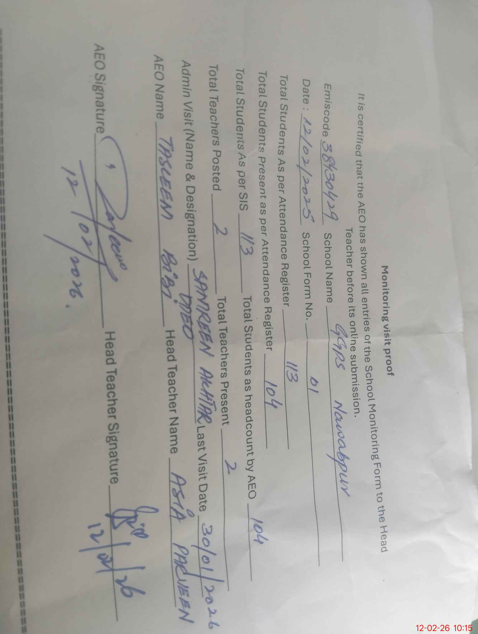 | Attendance Register | Head Teacher | MEA with School | Visit Proof |