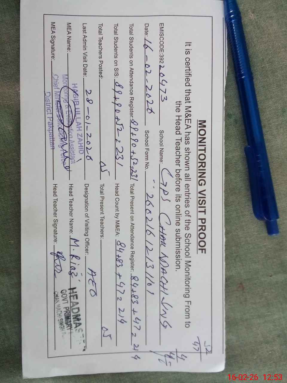 | Attendance Register | Head Teacher | MEA with School | Visit Proof |
