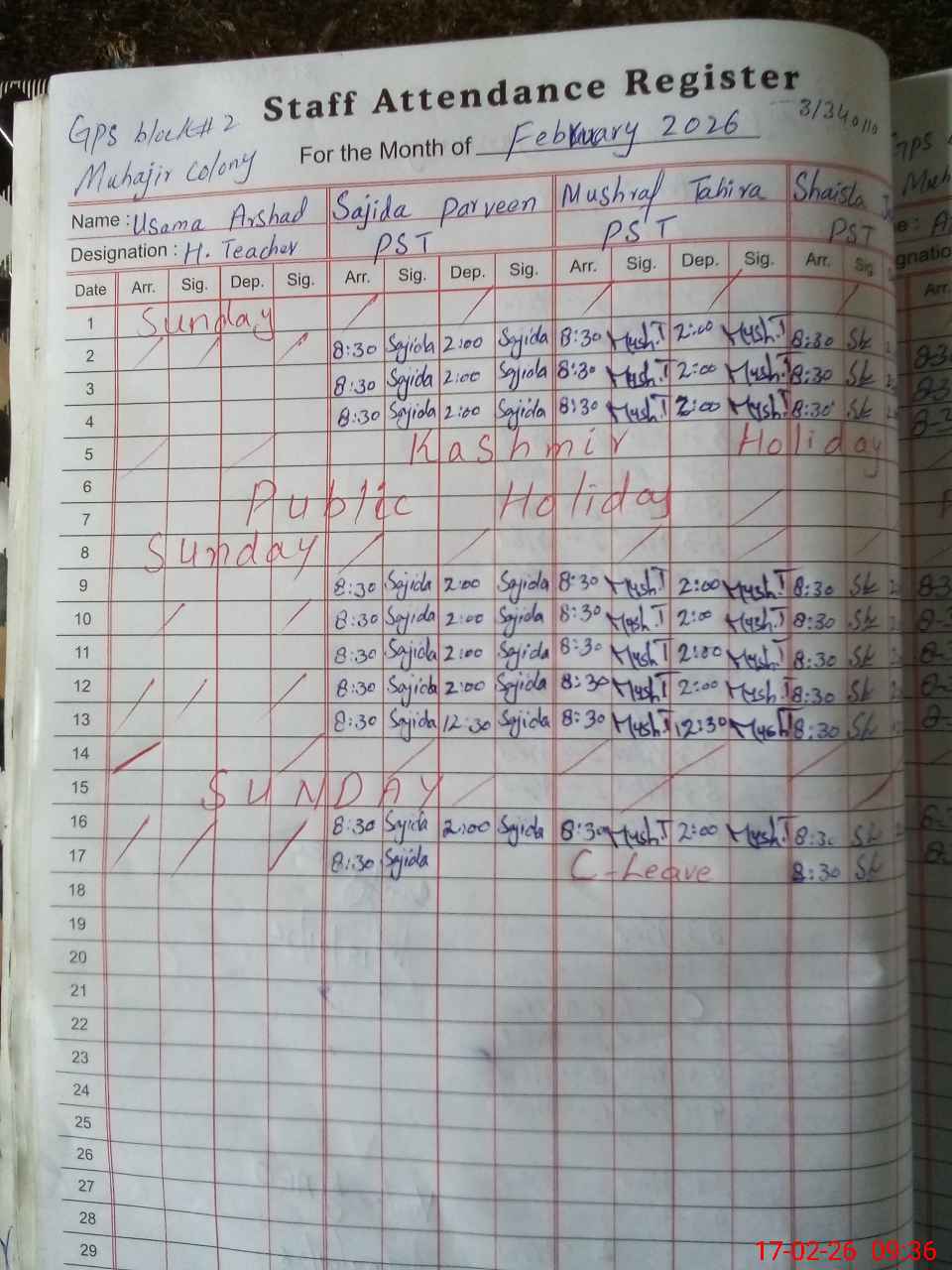 | CNIC | Full Name | Designation | R/C | Absence During Last Calender Month |