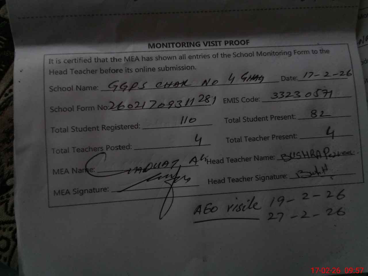 | Attendance Register | Head Teacher | MEA with School | Visit Proof |