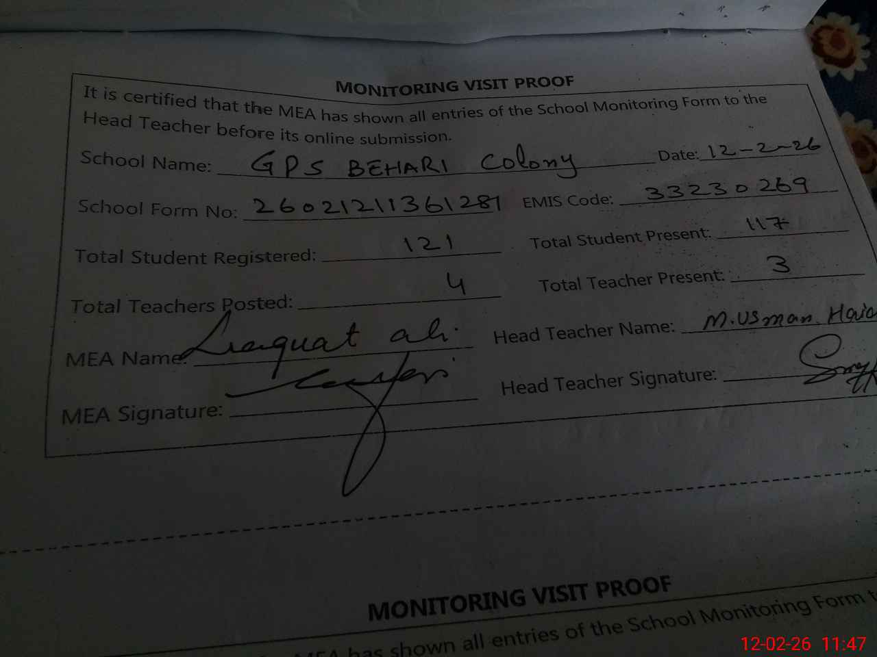 | Attendance Register | Head Teacher | MEA with School | Visit Proof |