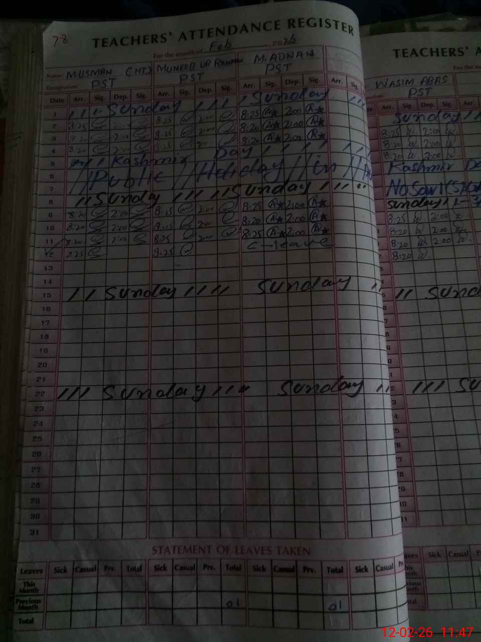 | CNIC | Full Name | Designation | R/C | Absence During Last Calender Month |