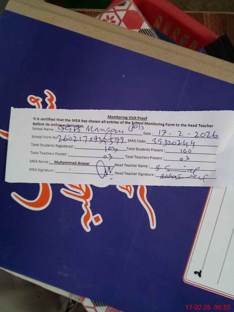| Attendance Register | Head Teacher | MEA with School | Visit Proof |