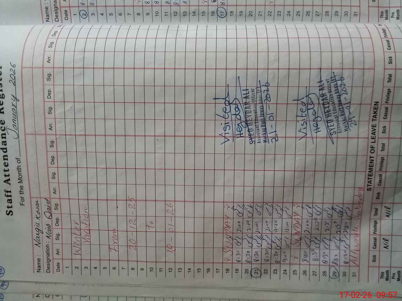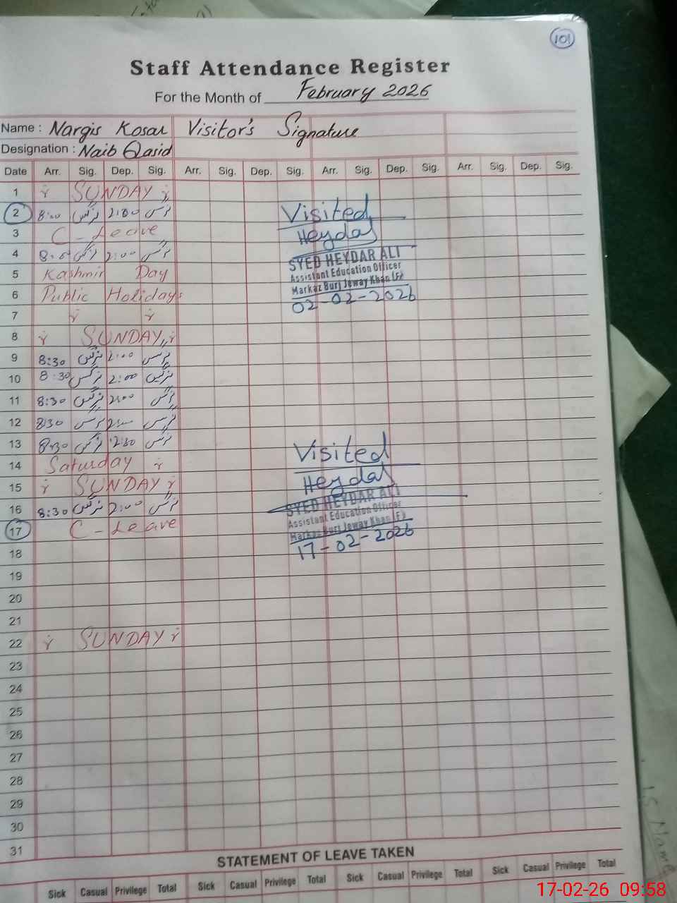 | 35**** | Na**** Ko**** | NAIB QASID | Regular | 2 | 0 | 0 | 0 | 0 | 0 | 0 | 0 | 2 | Casual |