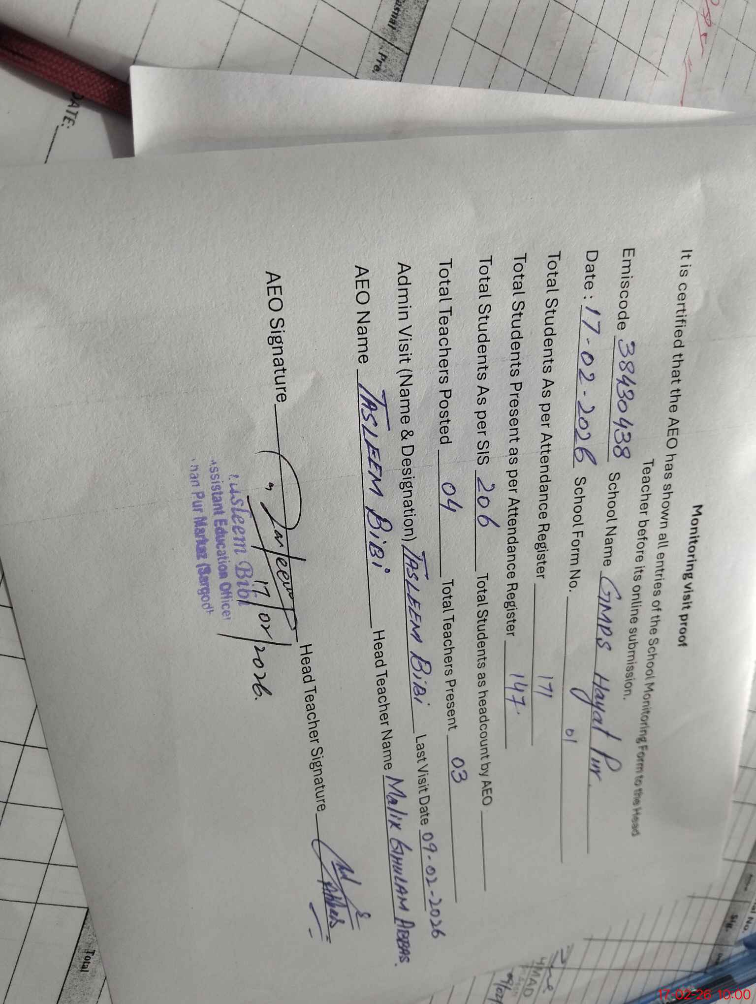 | Attendance Register | Head Teacher | MEA with School | Visit Proof |