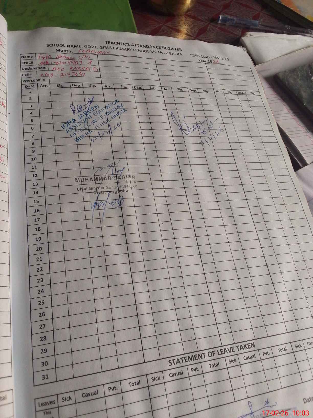| Name: FO**** HA**** Designation: (School Headmaster's/Headmistress's) PST Phone/Cell Number: 03**** |