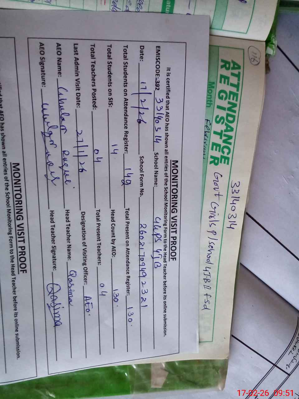 | EMIS Code: 33140314 | Name of School: GGPS chak 4 JB | |||