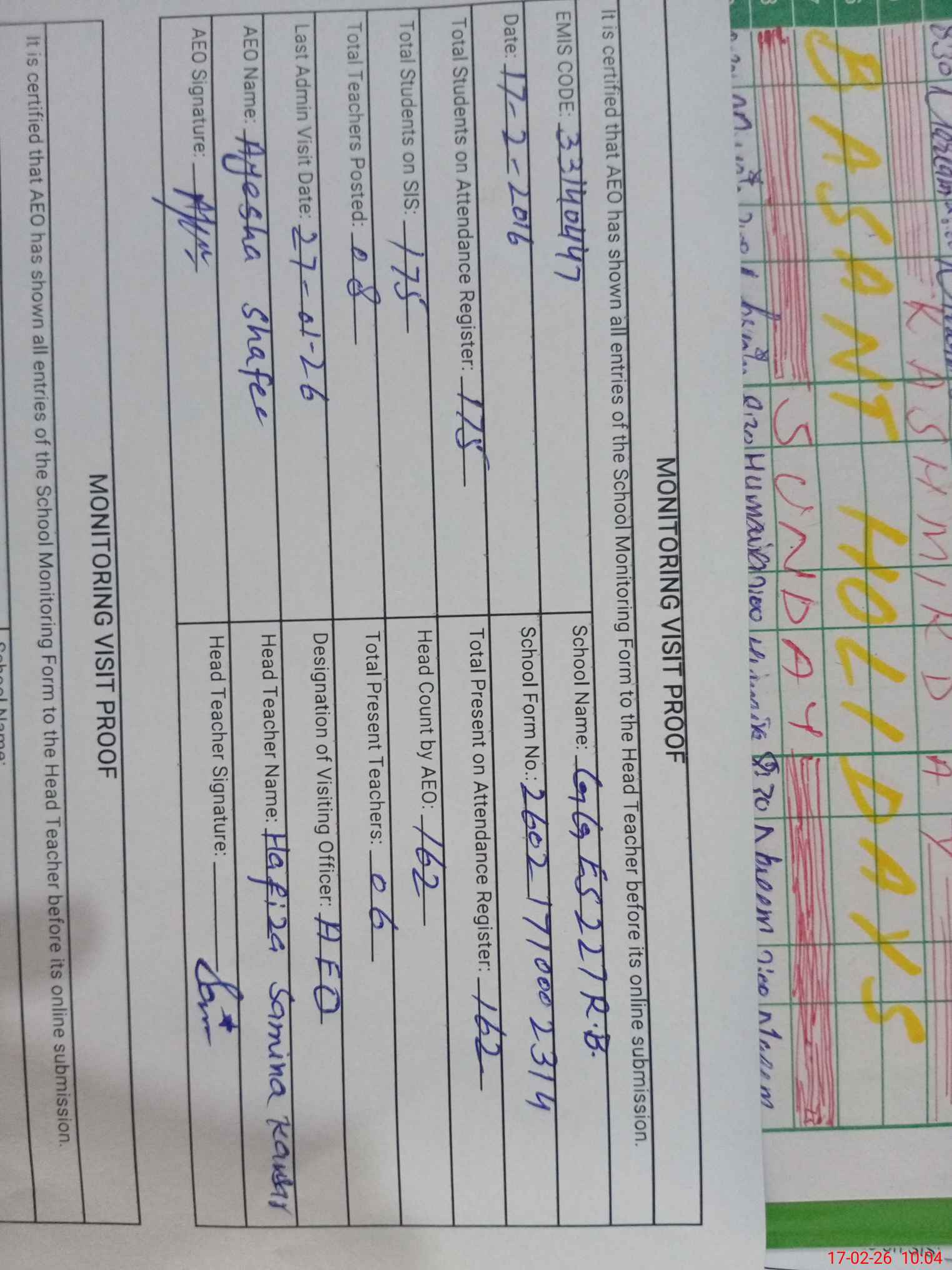 | Certified that this School was Inspected by the Undersigned MEA/DMO Today and the Information Stated Above is as Per Record. | |||||