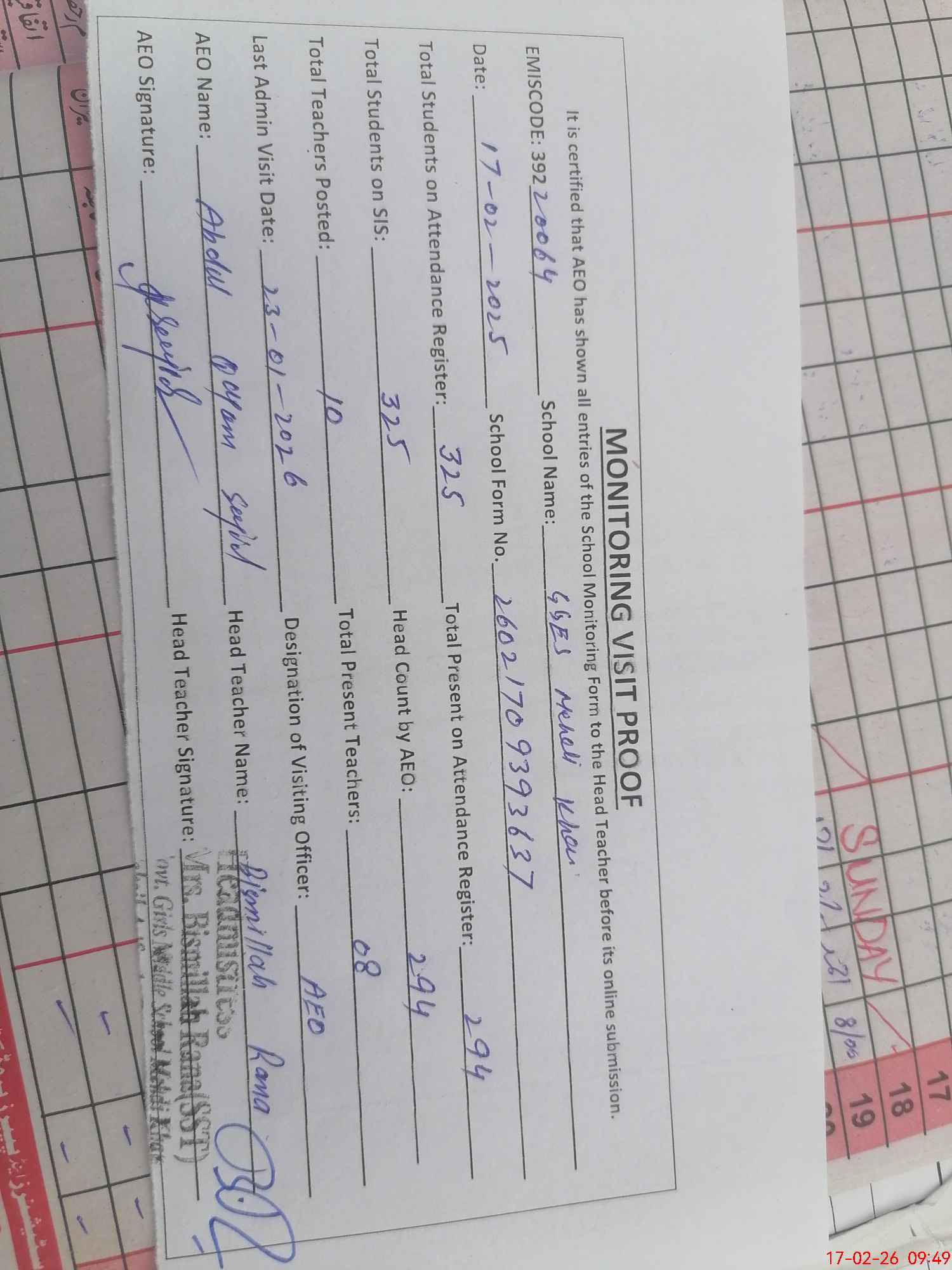 | Certified that this School was Inspected by the Undersigned MEA/DMO Today and the Information Stated Above is as Per Record. | |||||