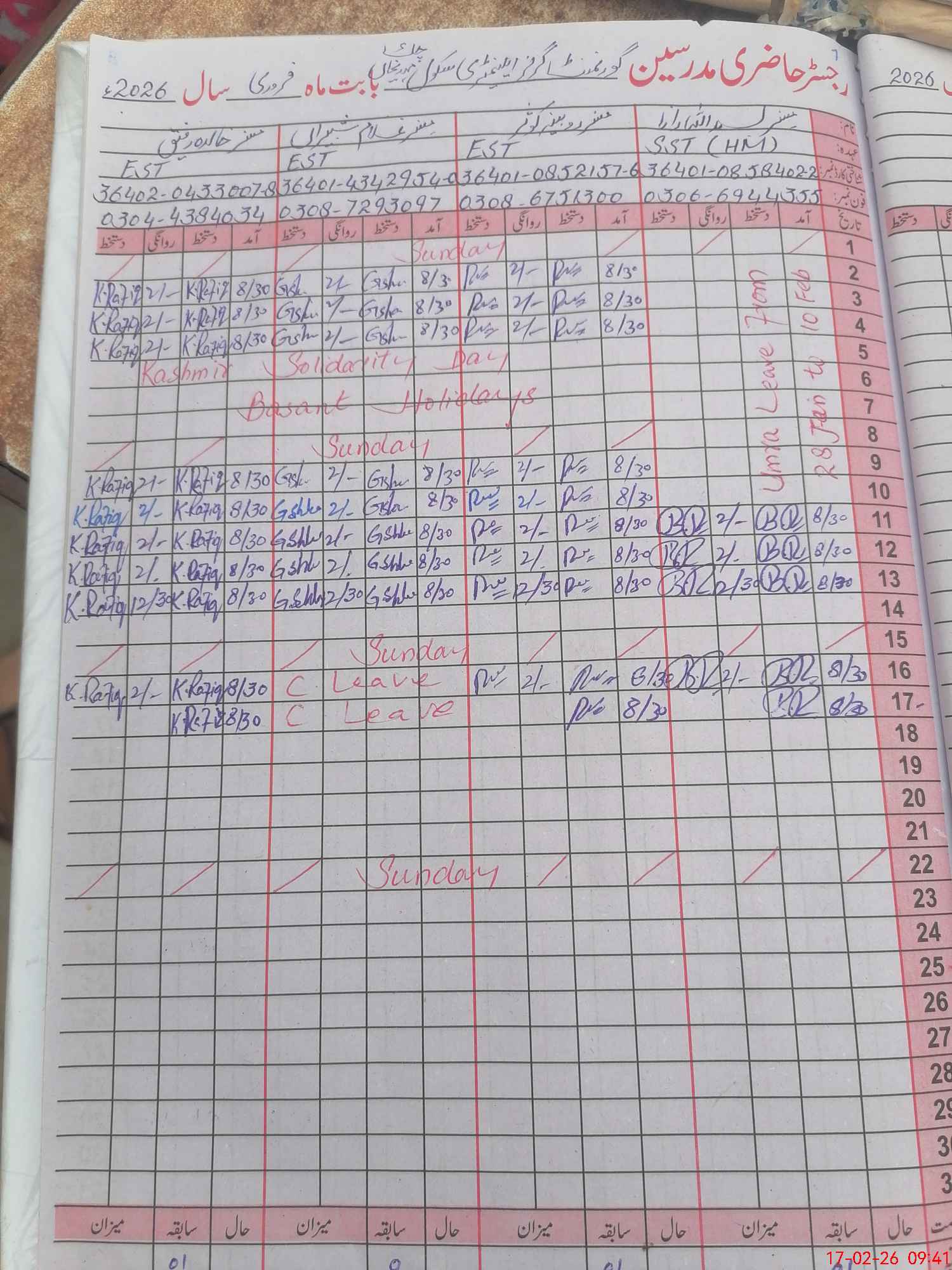 | Name: BI**** KH**** Designation: (School Headmaster's/Headmistress's) SST (GENERAL) Phone/Cell Number: 03**** |
