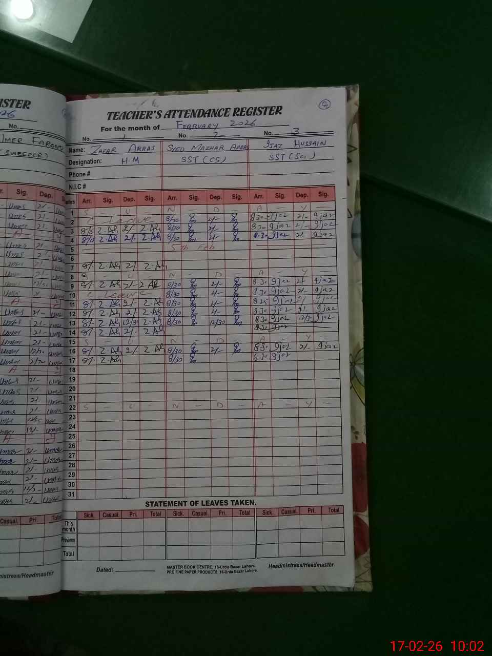 | CNIC | Full Name | Designation | R/C | Absence During Last Calender Month |