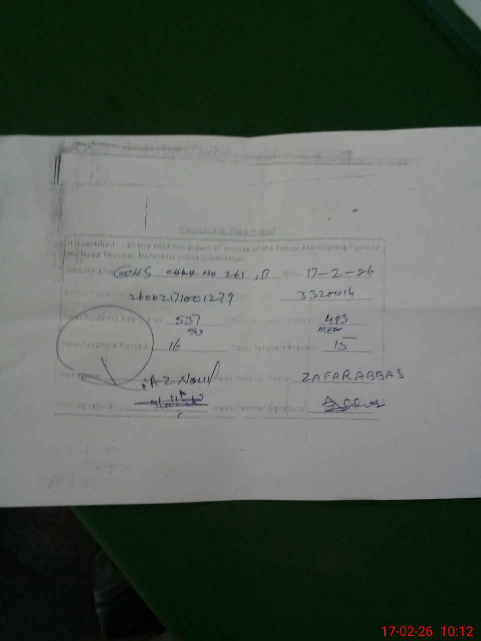 | Name: Za**** Ab**** Designation: (School Headmaster's/Headmistress's) SST Phone/Cell Number: 03**** |