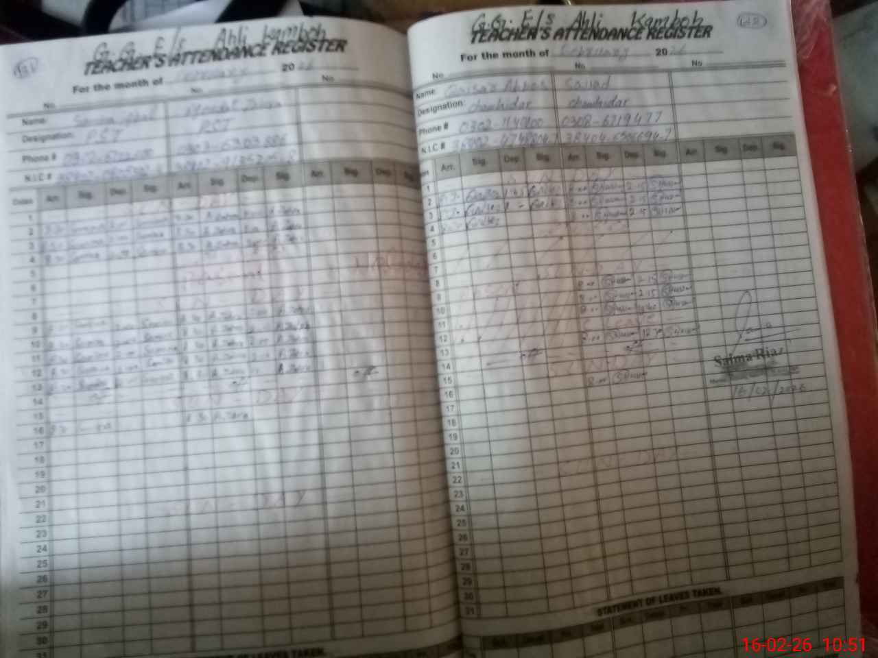 | CNIC | Full Name | Designation | R/C | Absence During Last Calender Month |