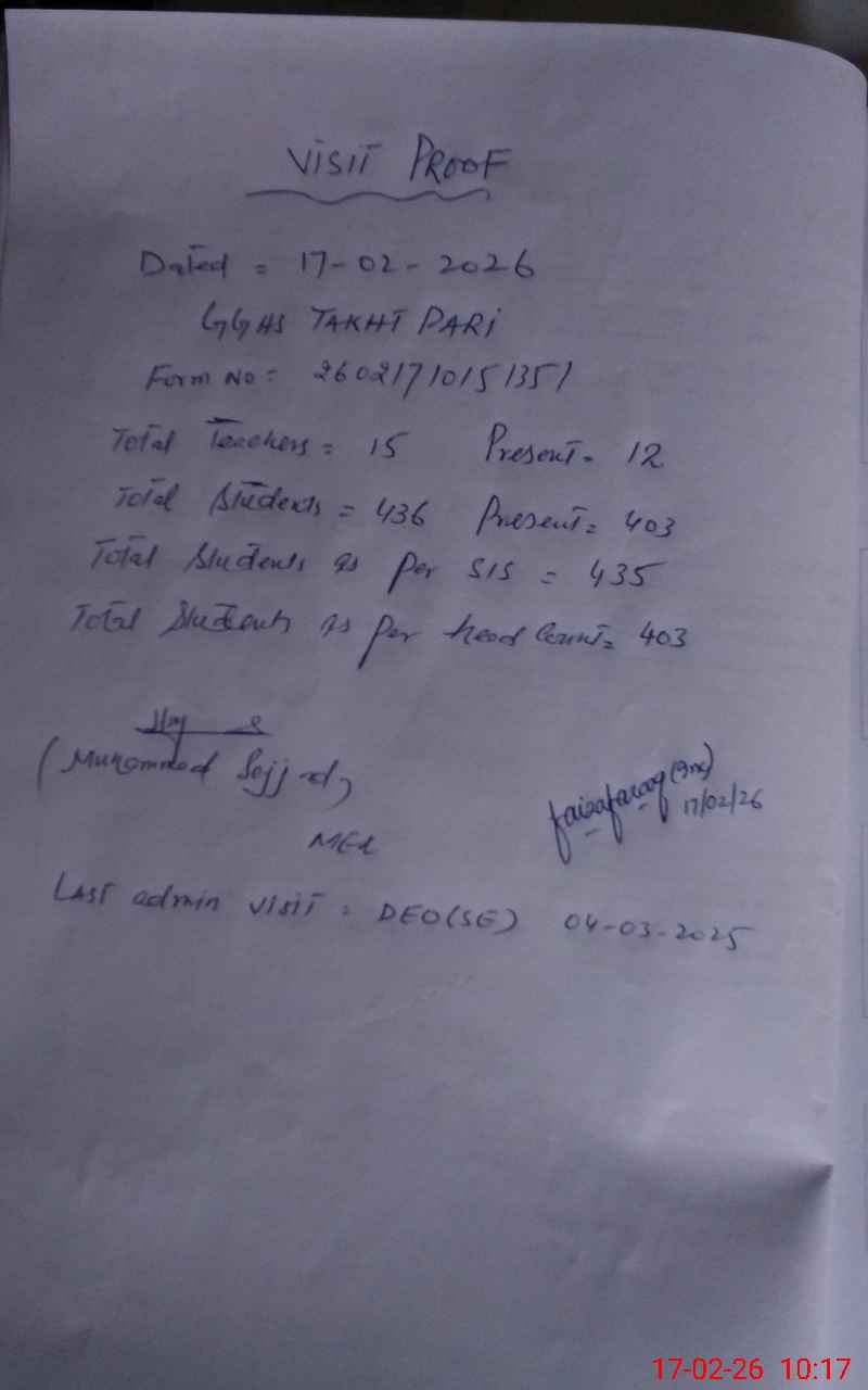 | EMIS Code: 37330171 | Name of School: GGHS TAKHAT PARI | |||