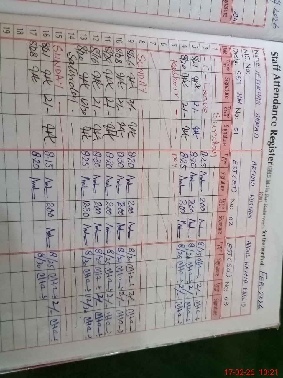 | CNIC | Full Name | Designation | R/C | Absence During Last Calender Month |