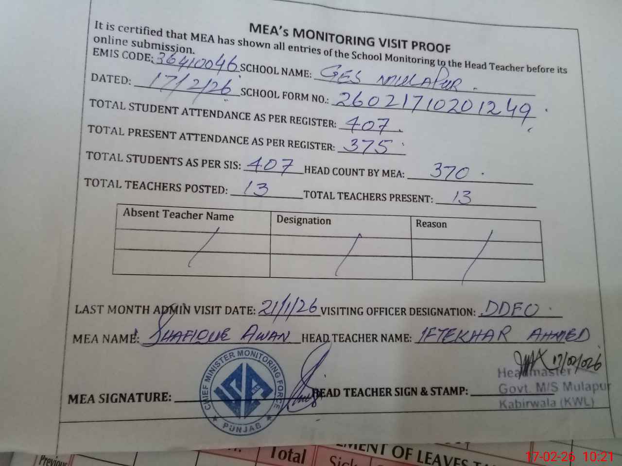 | Attendance Register | Head Teacher | MEA with School | Visit Proof |