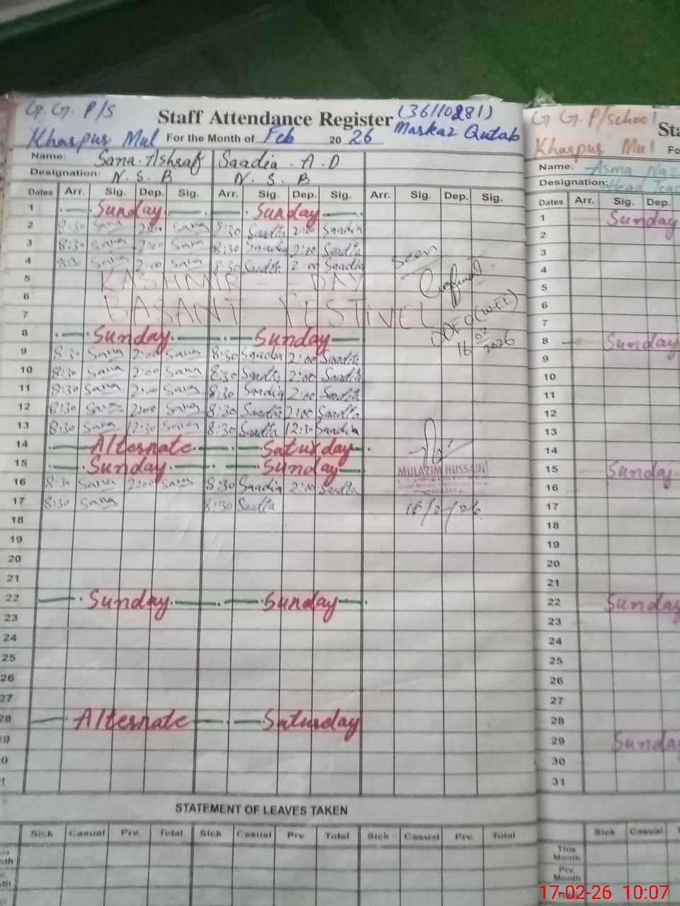 | CNIC | Full Name | Designation | R/C | Absence During Last Calender Month |