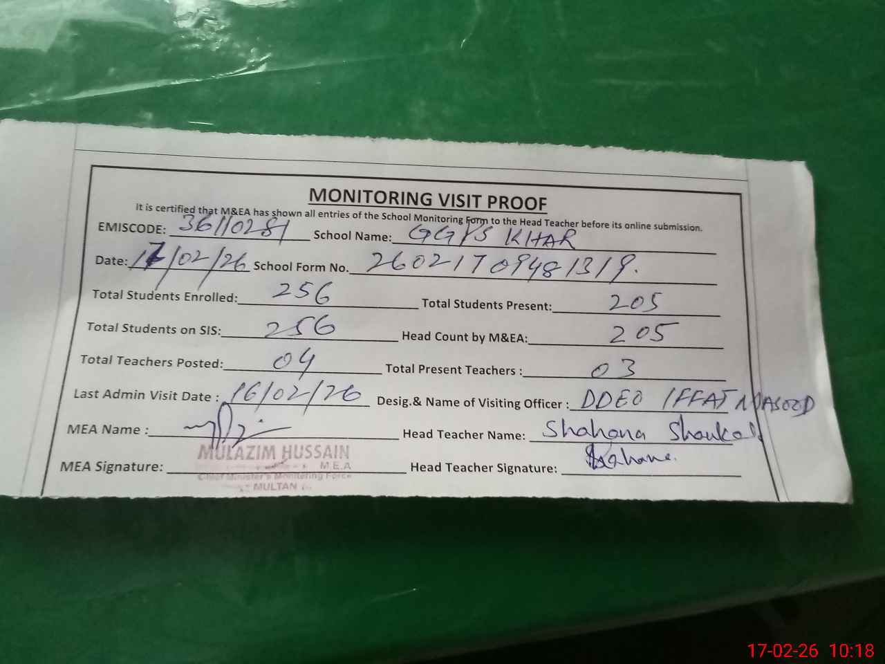 | Attendance Register | Head Teacher | MEA with School | Visit Proof |