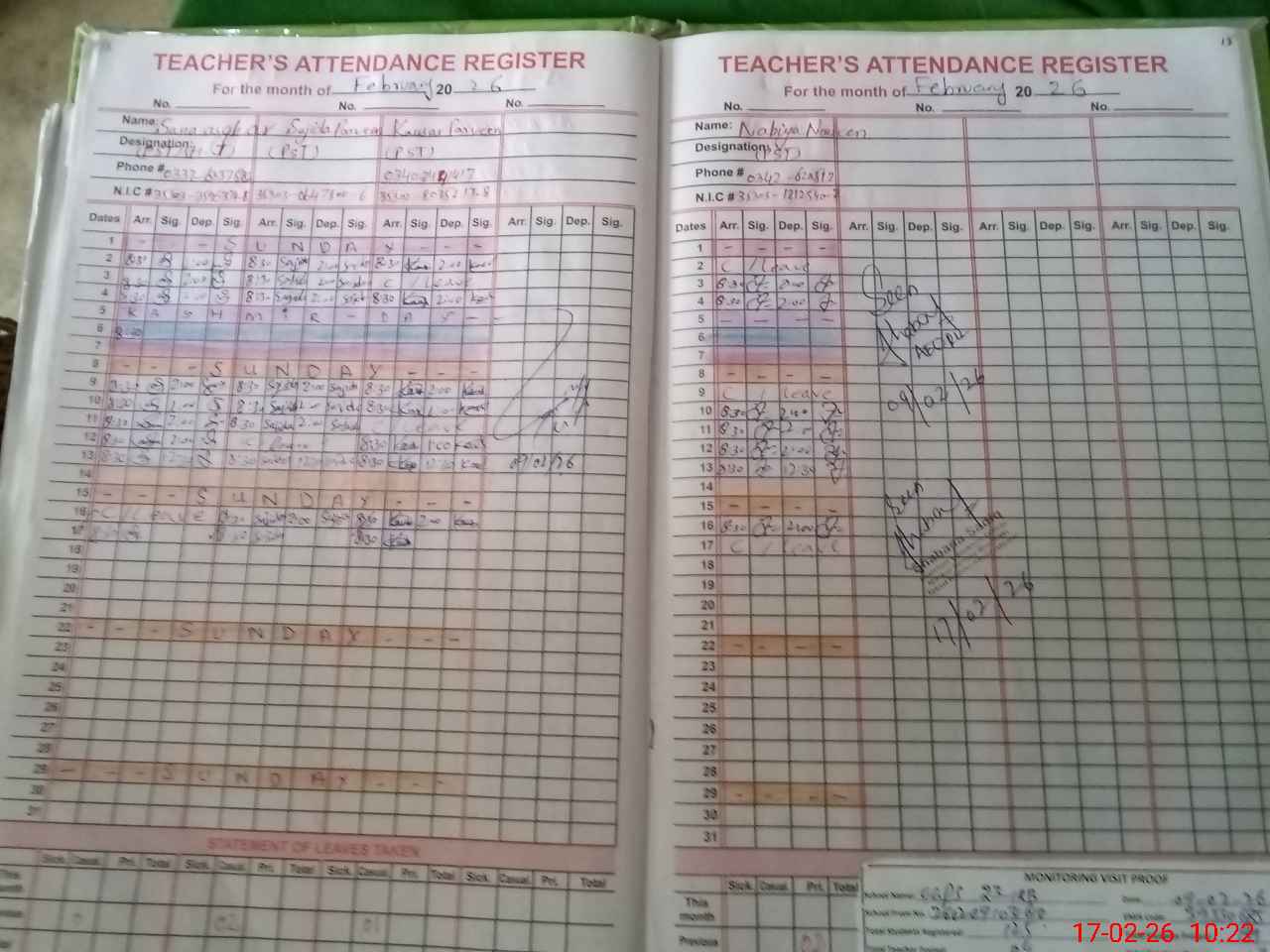 | CNIC | Full Name | Designation | R/C | Absence During Last Calender Month |