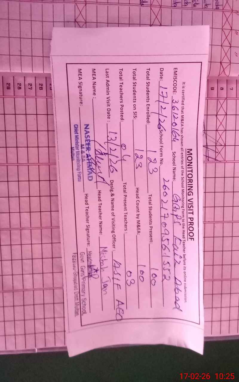 | EMIS Code: 36120164 | Name of School: GGPS FAIZ ABAD SHUJABAD | |||
