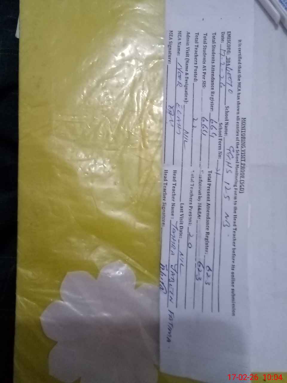 | Attendance Register | Head Teacher | MEA with School | Visit Proof |