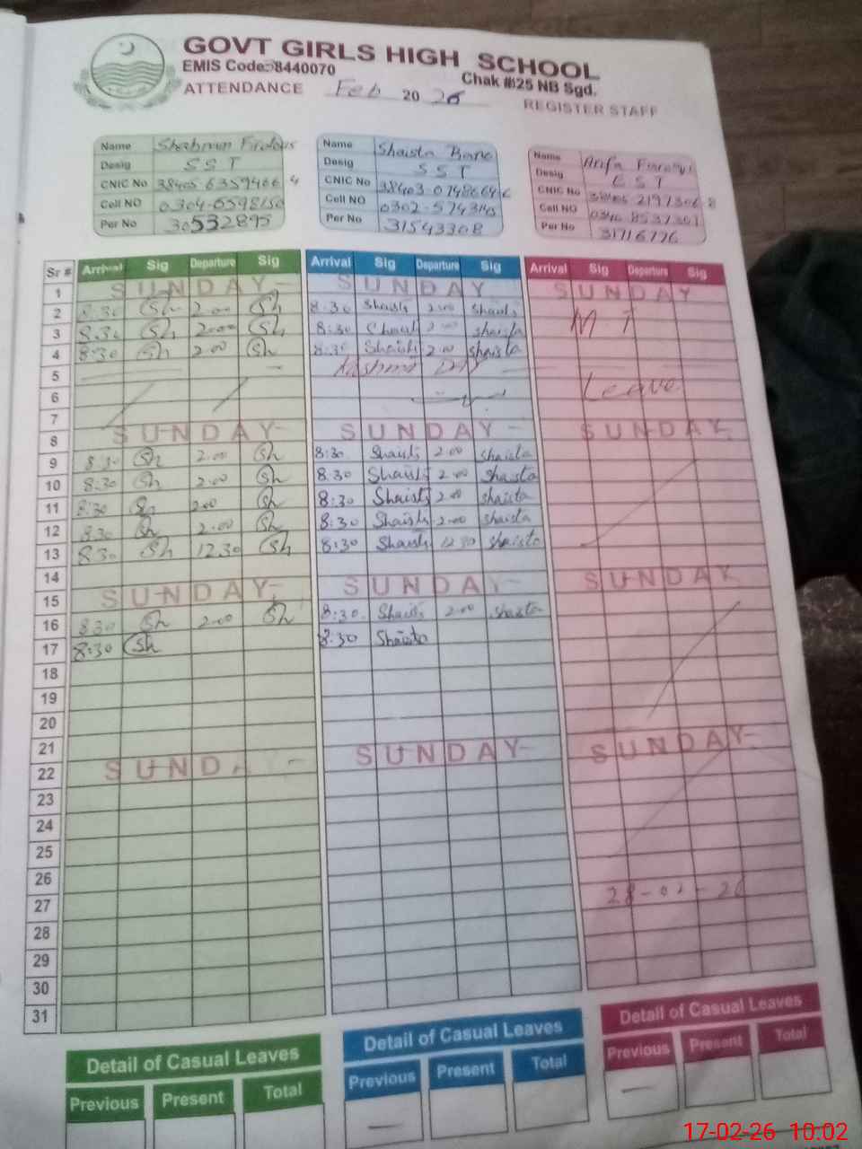 | CNIC | Full Name | Designation | R/C | Absence During Last Calender Month |