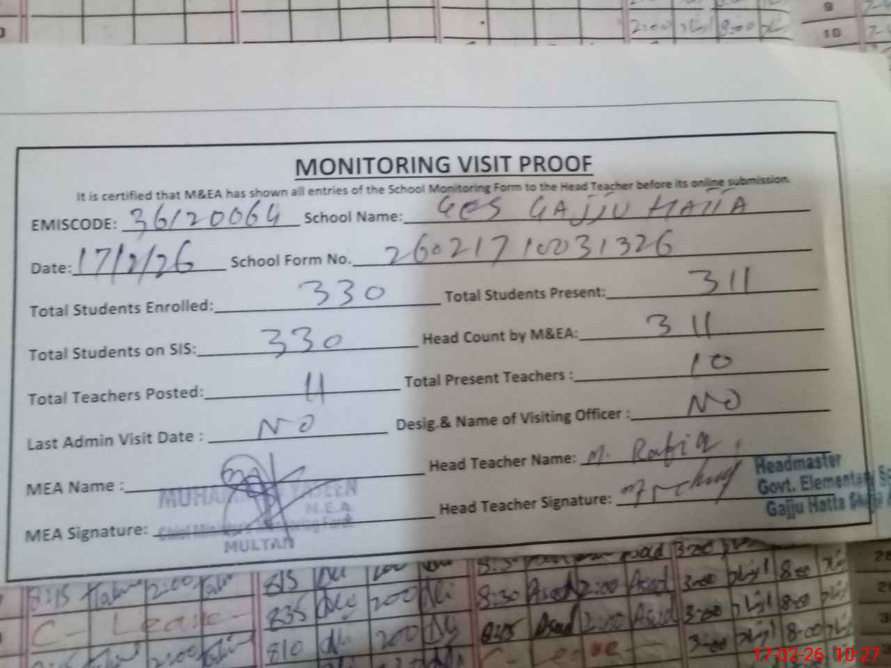 | Attendance Register | Head Teacher | MEA with School | Visit Proof |