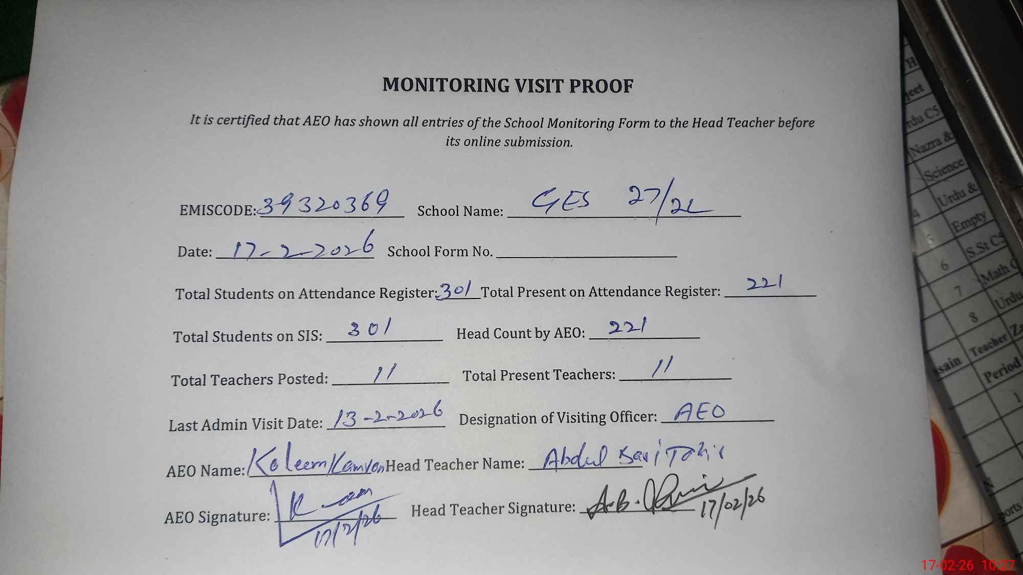 | Attendance Register | Head Teacher | MEA with School | Visit Proof |