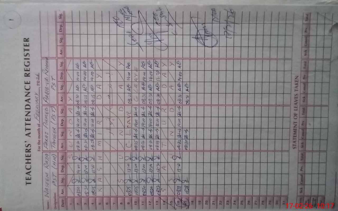 | CNIC | Full Name | Designation | R/C | Absence During Last Calender Month |